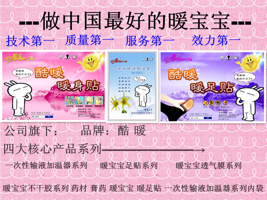 程豐產品介紹:【浙江地區專供輸液加溫器批發代理】 輸液在現代臨床治療中應用廣泛,但在寒冷的環境下對病人進行輸液時,冰冷的藥水直接進入人體會造成發冷。甚至麻木疼痛.寒顫等不適感。目前人們通常采用暖水袋和熱水瓶等傳統的加熱方式,使藥業溫度忽高忽低,對藥物的穩定性和療效有一定的負面影響。而且使用極不方便。產品可使流出的藥液溫度控制在45°C-48°C以下,因此也不會破壞藥物成份或影響藥效。本產品遇空氣自動升溫,不需外接電源,且有效溫度能持續4小時左右,酷暖輸液貼產品外袋采用環保材料,原料無毒.無污染使用方便,安全可靠,無副作用。