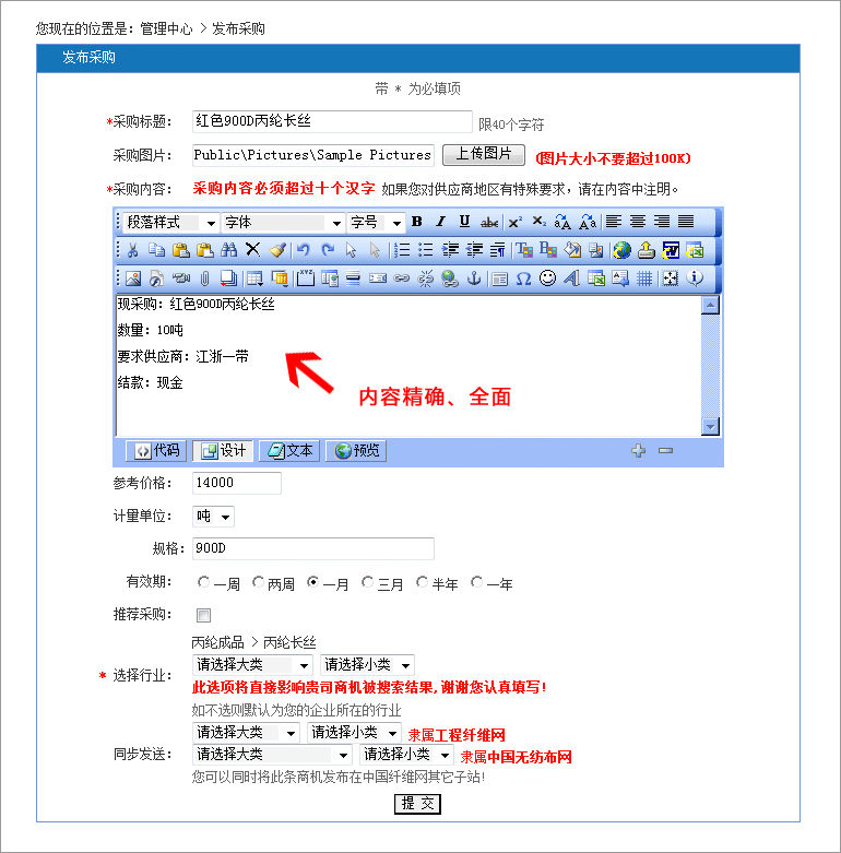 點(diǎn)擊后臺的發(fā)布采購,在右側(cè)內(nèi)容中,全面、精確地寫下您的采購需求,有益于供應(yīng)商更好地為您報(bào)價(jià)和服務(wù)。