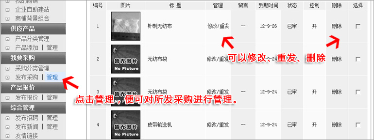 點(diǎn)擊"我要采購"下面的"管理",便可以對以往采購進(jìn)行修改、重發(fā)、刪除。
